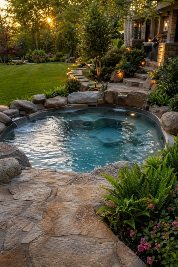 This approach softens the edges of a built in jacuzzi and makes it feel tied to the yard. Use native plants and gravel paths to keep the space relaxed and cohesive.