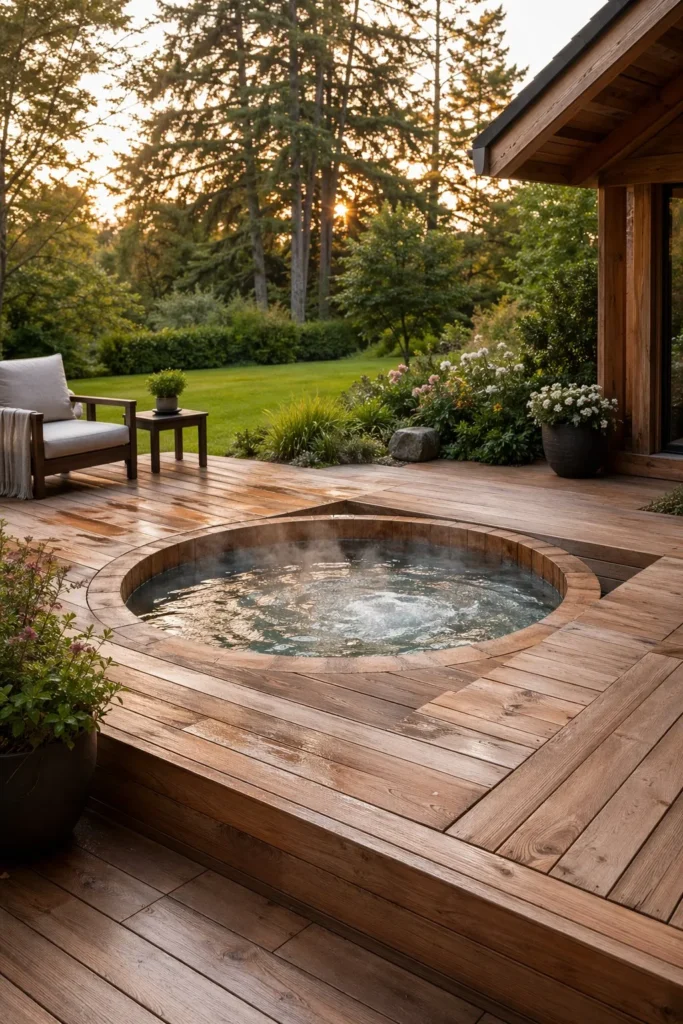 This look is simple, warm, and easy to style. It is a great add-on for sunken hot tub deck ideas where you want a tucked-away retreat.