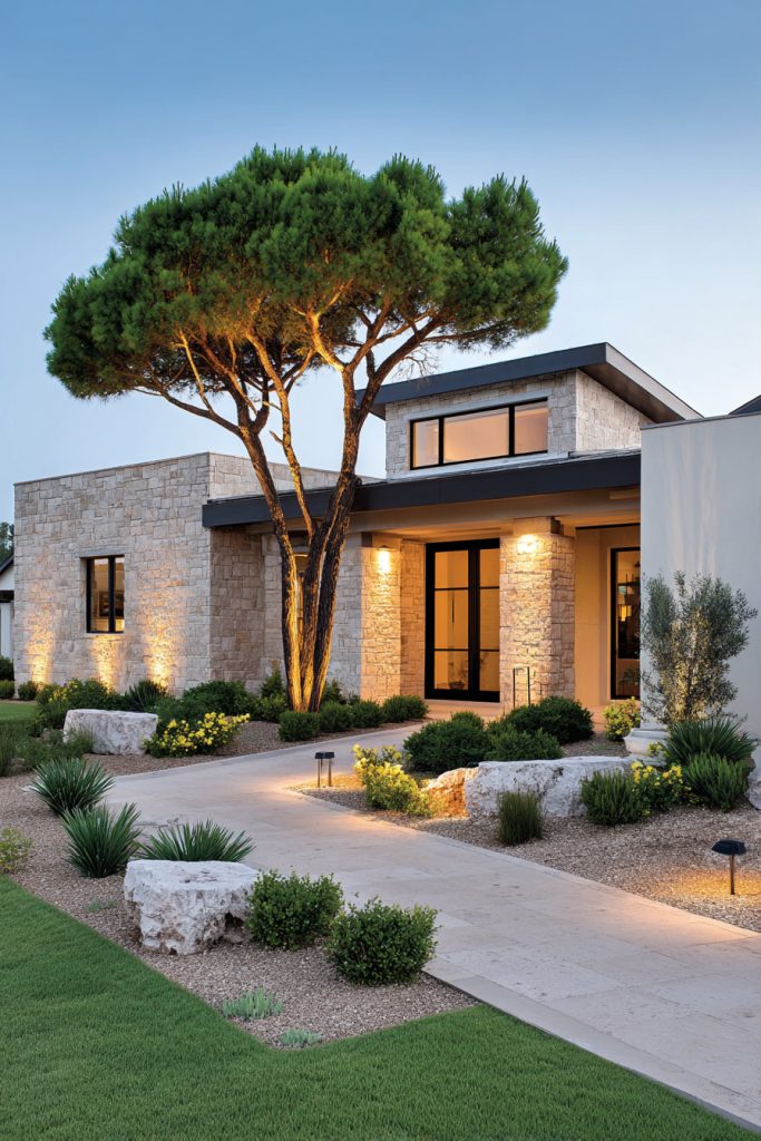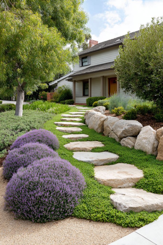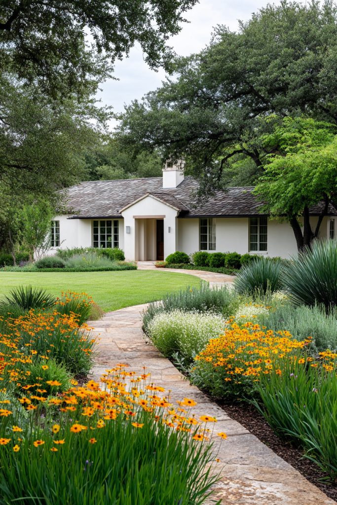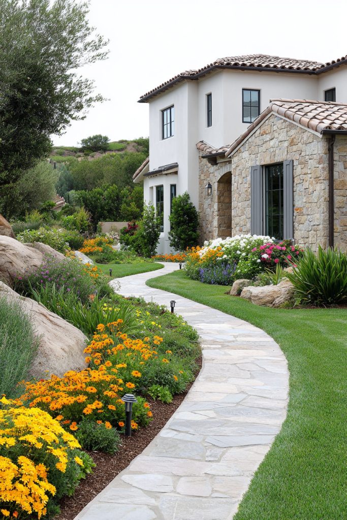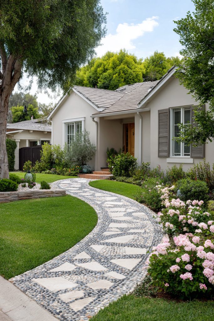 You can add charm to your front yard with a curved stone pathway. The soft curves create a natural, welcoming look.