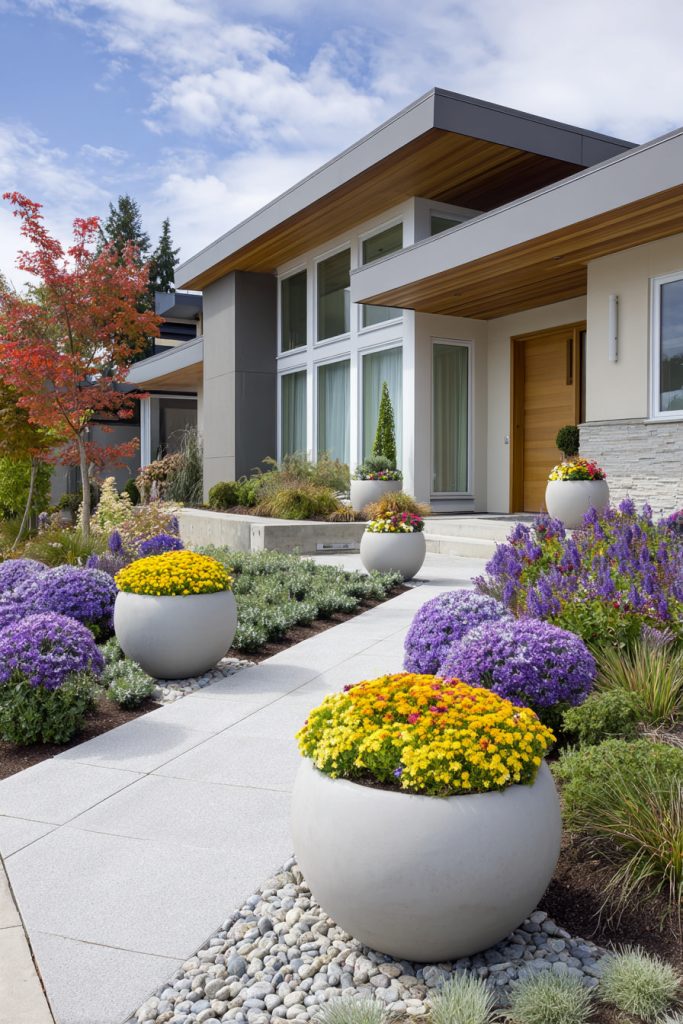 You can use large ceramic planters to add color and life to your front yard. These pots work well for seasonal flowers, so you can change them throughout the year.