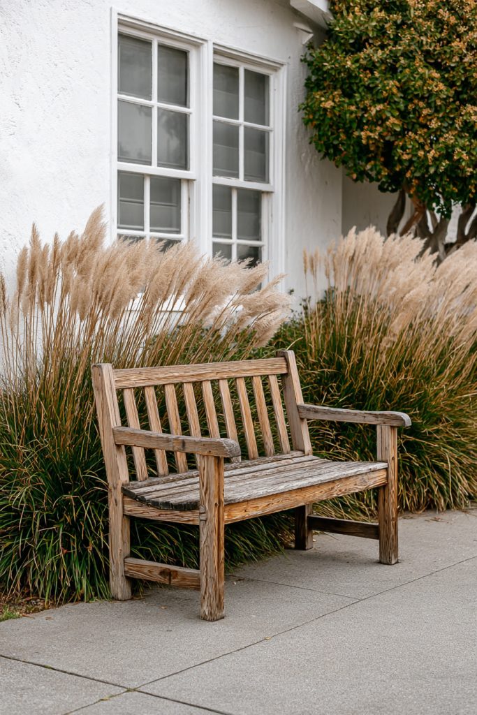 Tall grasses add movement and softness around the bench. Adding a few cozy cushions will make your space inviting for quiet moments outdoors.