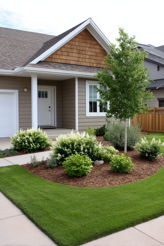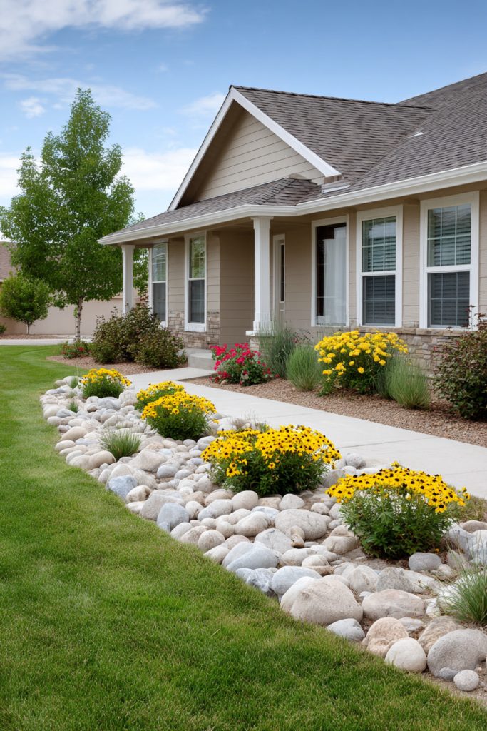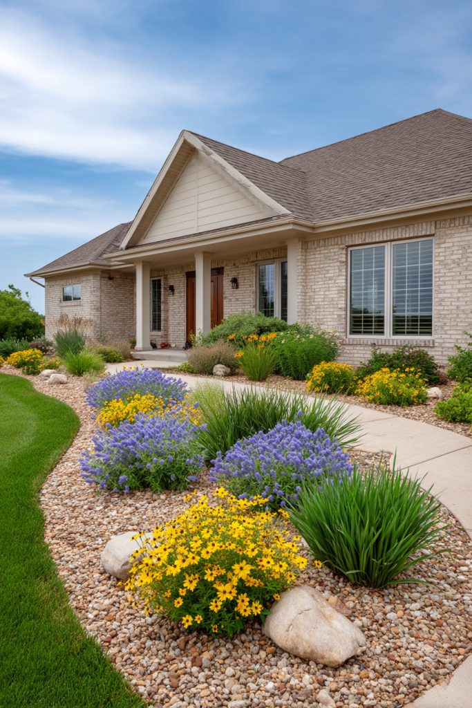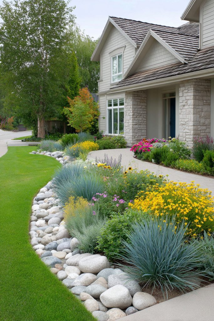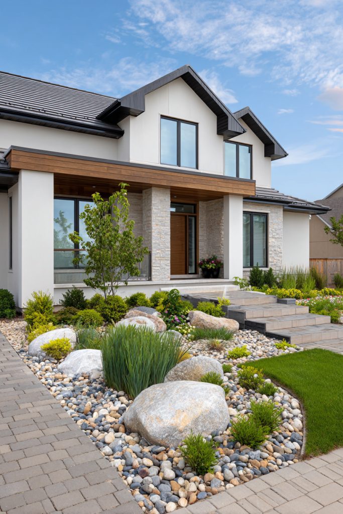 You can give your front yard a fresh look by adding a pebble garden. Pebbles add natural texture and keep things low-maintenance.