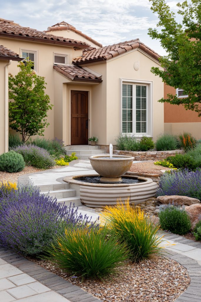 You can add charm to your front yard by building a small fountain near your entrance. It creates a calming sound that welcomes guests softly.