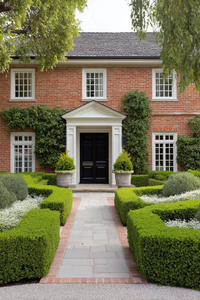 You can use boxwood hedges to add a clean, polished look around your front door. These shrubs are easy to shape and keep neat.