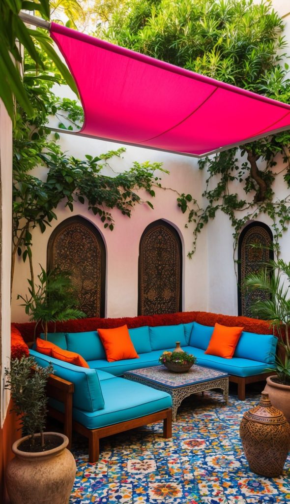 You can install a permanent structure or opt for removable canvas awnings that you can adjust as needed. This simple addition will make your outdoor space more usable while adding authentic Moroccan charm.