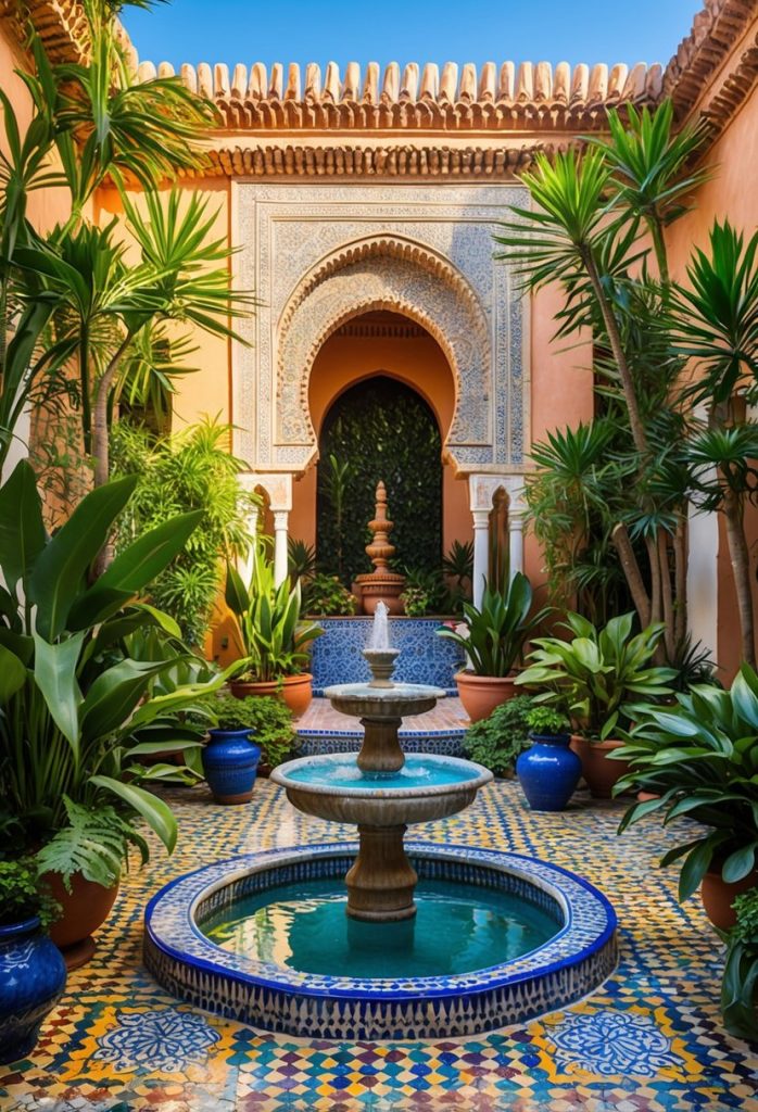 Add traditional elements like colorful tiles, a small fountain, and lush plants. Palms work well even in cooler climates.