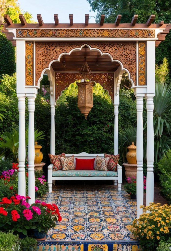 A Moroccan-style pergola can add both shade and visual appeal to your garden. You can dress it up with colorful fabrics or climbing plants for that authentic feel.