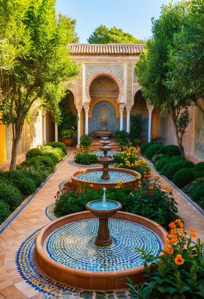 Moroccan gardens shine with colorful tiles that add charm and personality. You can use these tiles on walls, floors, or steps to create a bold statement. Try blue and white patterns for a classic look, or go with bright colors for a more festive feel.