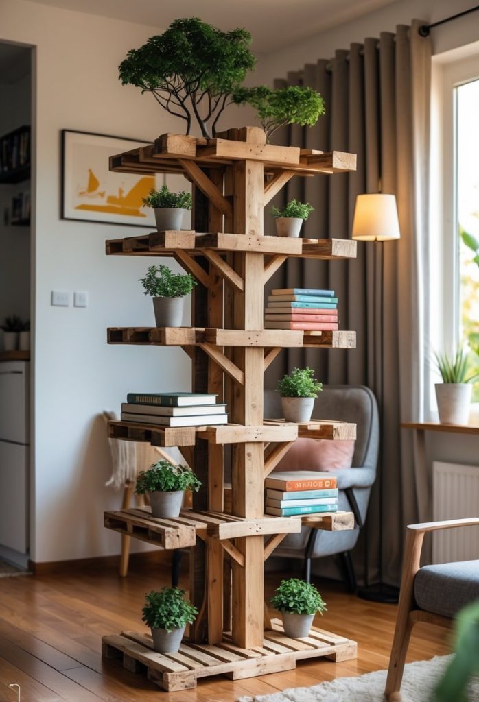 Arrange the pallets to form branches and shelves, then sand and paint them for a finished look. This shelf fits well in small spaces and adds a natural touch to your room.