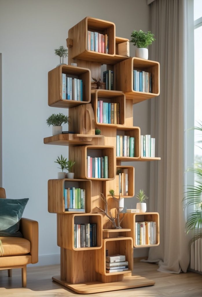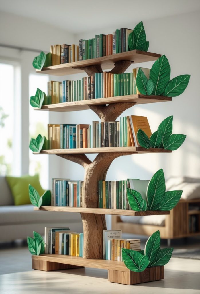 You can save floor space with a minimalist wooden tree bookshelf. Its clean design uses vertical space well.