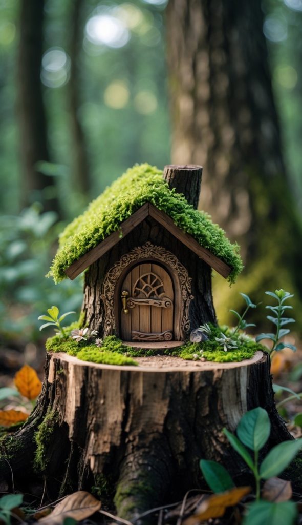 You can carve a small door into the tree stump to make a cozy fairy entrance. Etch simple vine patterns around the door to add a natural, charming touch. This design keeps your fairy house looking inviting and connected to nature.