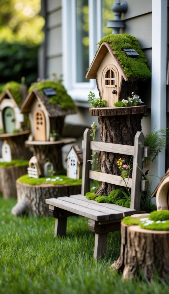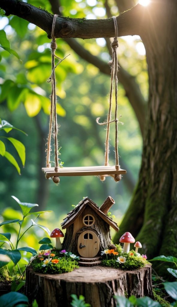 You can add a tiny swing hanging from a branch near your tree stump house. Use small ropes and a flat piece of wood or a leaf as the seat. This simple touch makes your fairy garden feel more lively and fun.