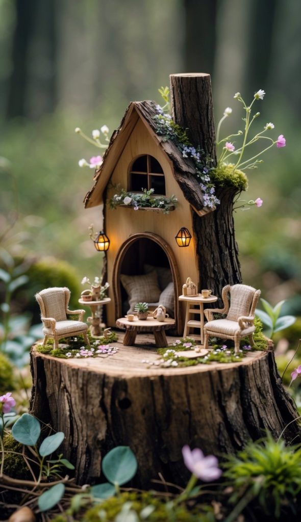 You can add real miniature furniture to your tree stump fairy house. Tiny chairs, tables, and beds make the home feel more alive.
