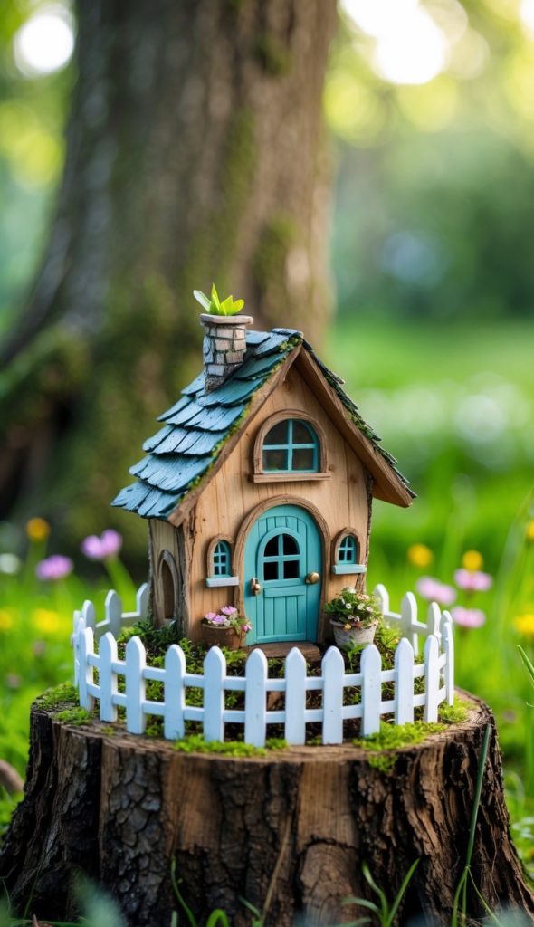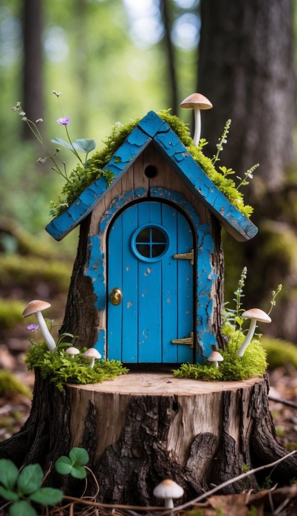 You can add charm to your tree stump by painting a small door in rustic blue. This color gives a calm and cozy feeling. Adding stone patterns or moss around the door makes it look more natural and inviting for fairy visitors.