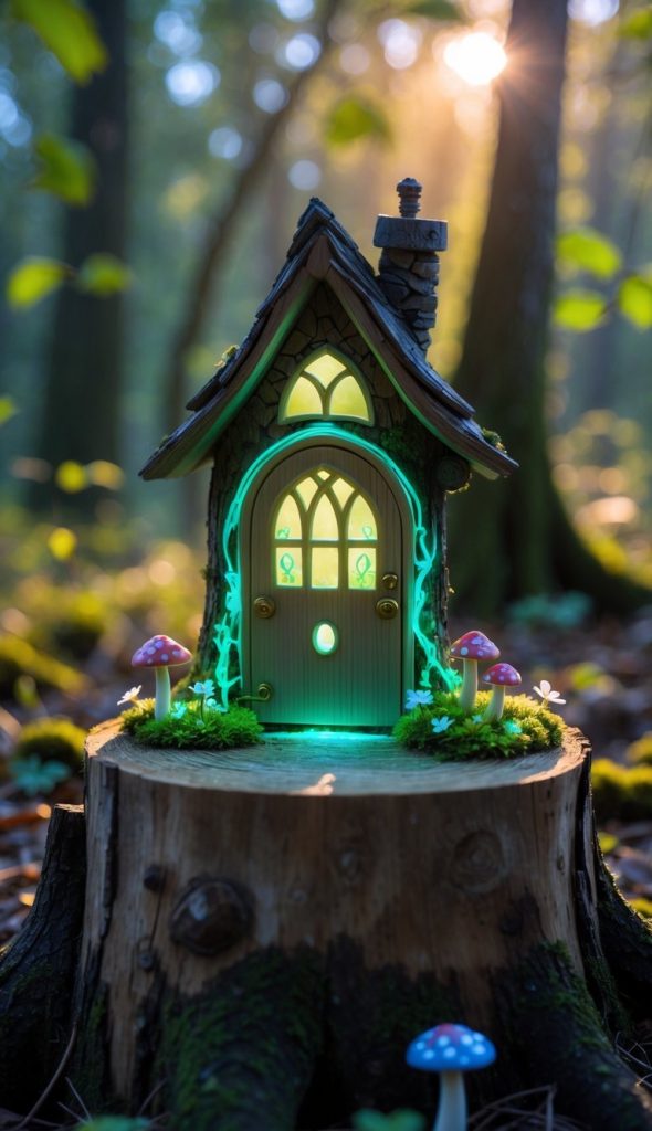 You can add a glow-in-the-dark fairy door to your tree stump for a magical touch. These doors light up at night, making your fairy house visible even in the dark. They often come with windows and small lanterns that glow without needing batteries.