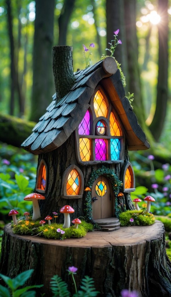 You can add tiny stained glass windows to your tree stump fairy house to make it look unique. Use colorful, translucent materials like plastic or old beads. These windows catch sunlight and give your fairy house a cheerful glow.