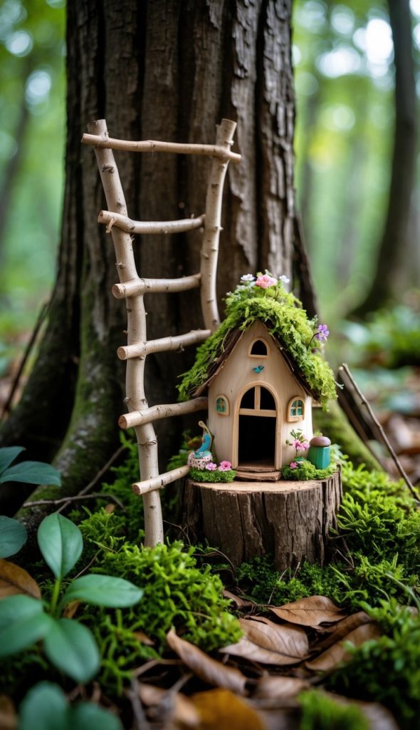 You can make a simple ladder for your fairy house using small twigs and string. Just tie the twigs together with twine or thin rope, spacing them evenly. This little ladder gives your fairies a fun way to climb up or down the tree stump.