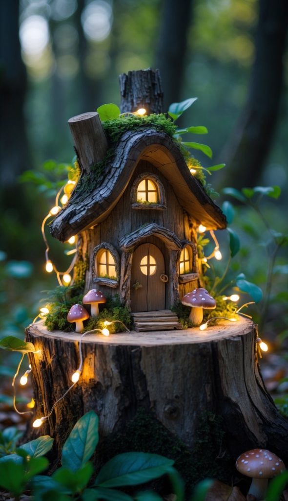 You can make your fairy house glow by wrapping it with small fairy lights. This adds a soft, magical glow, especially at night.