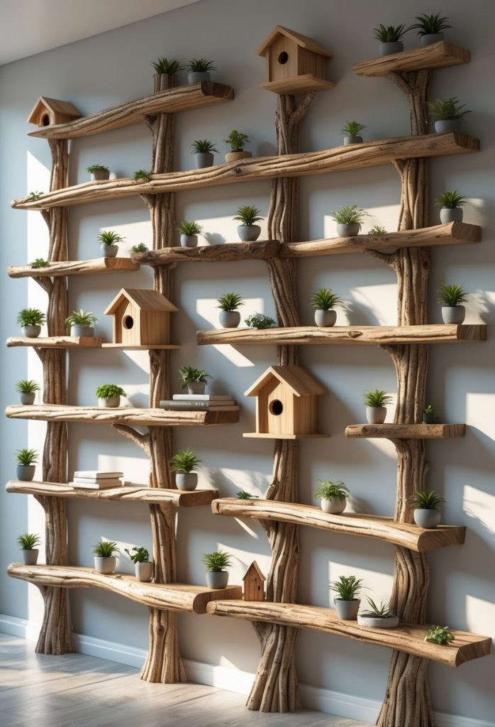 You can add charm to your space with a branch shelf that includes a birdhouse. It brings life and a natural touch right to your wall.