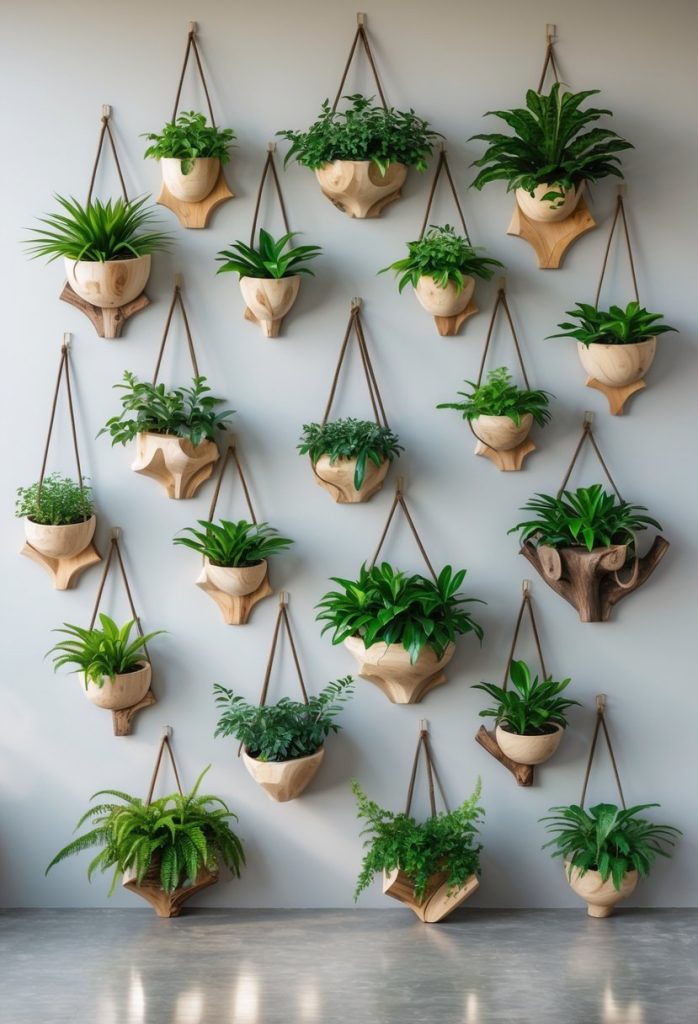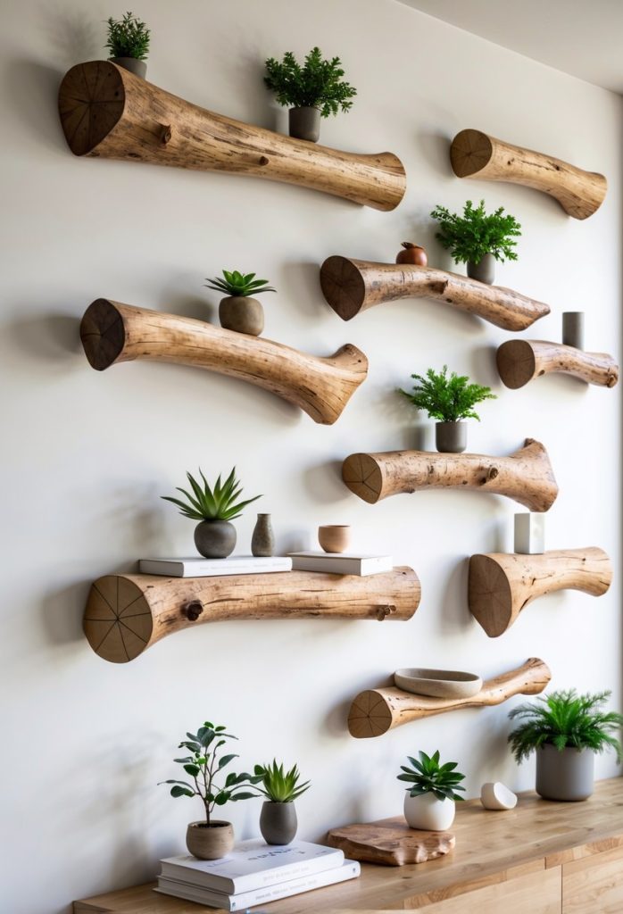 You can add hanging planters to a tree branch shelf for a fresh look. This mix of wood and green plants brings life to any room.