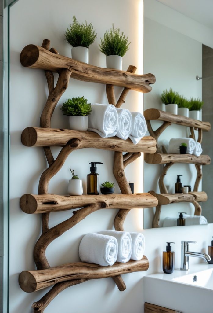You can add a natural touch to your bathroom with a twisted branch shelf. It fits well in small spaces and holds items like soap or towels.
