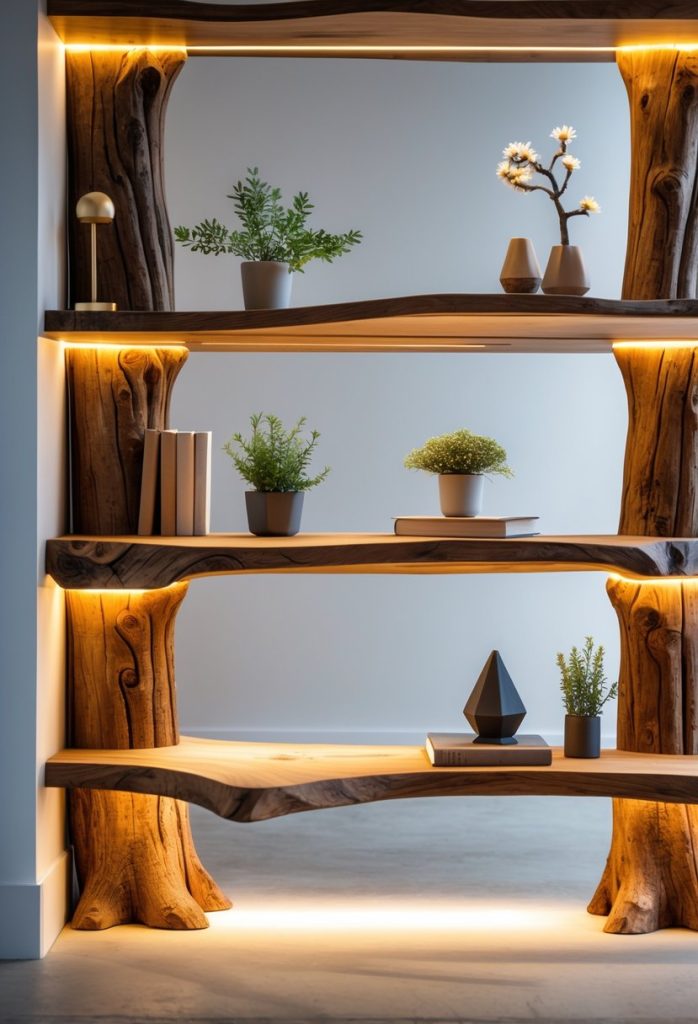 You can add a soft glow to your space by using a branch shelf with built-in LED lighting. The lights highlight the natural shape of the wood and create a cozy feel.