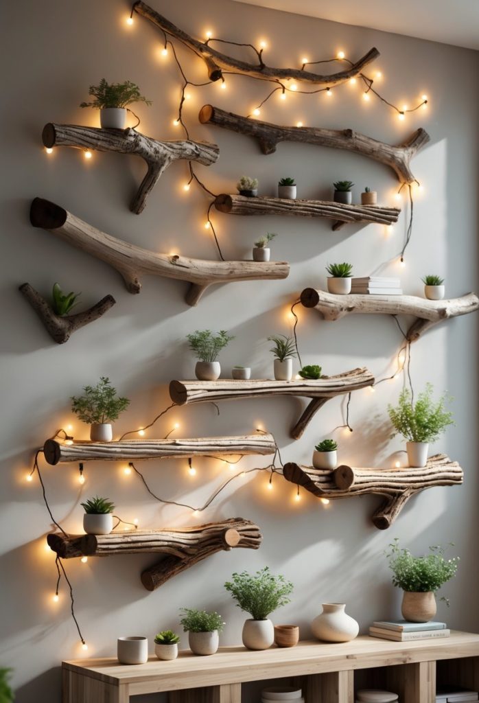 You can add a warm and magical touch by wrapping fairy lights around your branch shelf. The soft glow makes your space feel cozy and inviting.