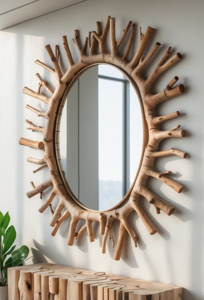 You can create a charming shelf by using an oval mirror framed with tree branches. This adds a natural, cozy look to your space.