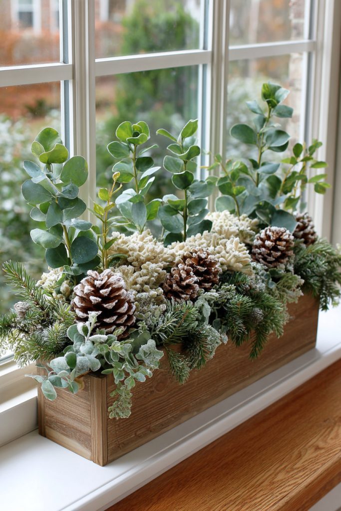 This combo works well for a winter window box because it lasts long and stays beautiful without much care. Add a few touches of white spray paint to the pinecones to create a frosty effect.