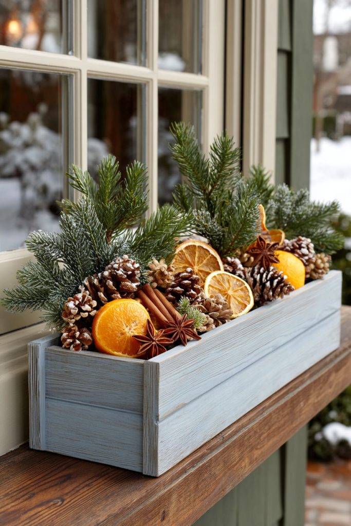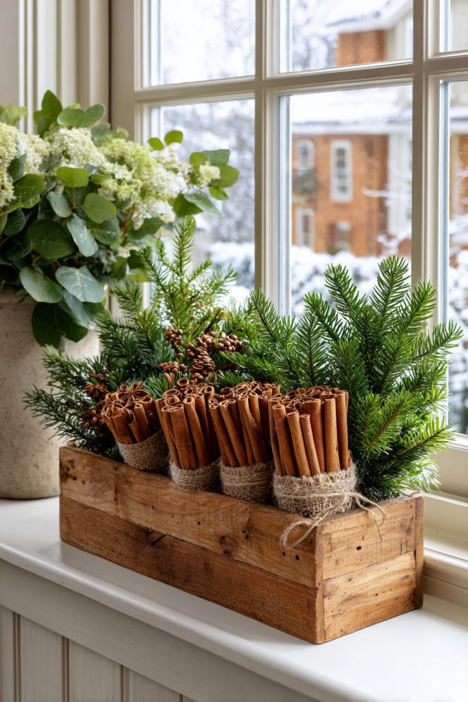 You can fill your window box with fresh pine branches to create a natural, green base. Add small bunches of cinnamon sticks tied with simple twine.