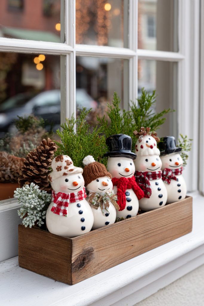 You can add charm to your window box with tiny snowman figurines. They bring a playful touch that fits perfectly with winter themes.
