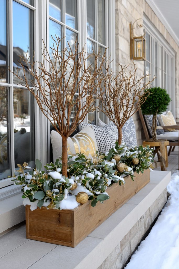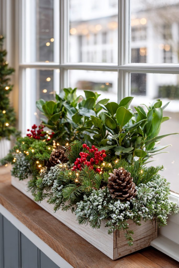 This combo is easy to put together and adds a bit of winter cheer without being too busy. It keeps your window box looking clean and stylish all season.