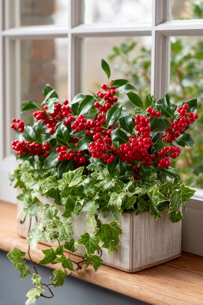 2. Bright red holly berries and ivy trails