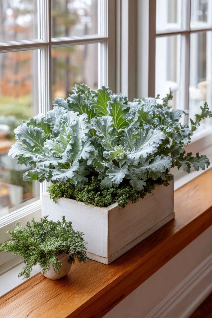 You can add sprigs of dusty miller to your winter window boxes for a soft, silvery touch. Its fuzzy leaves bring gentle texture that contrasts nicely with bright blooms or evergreen branches.